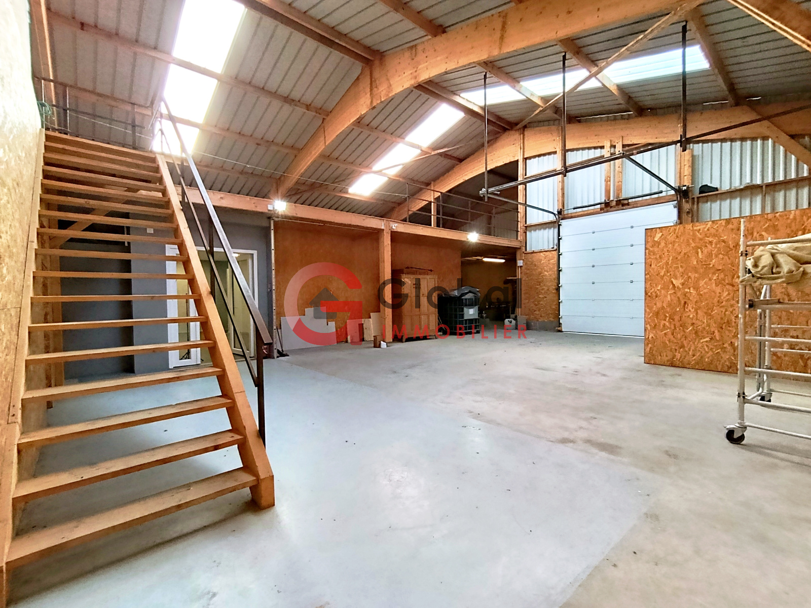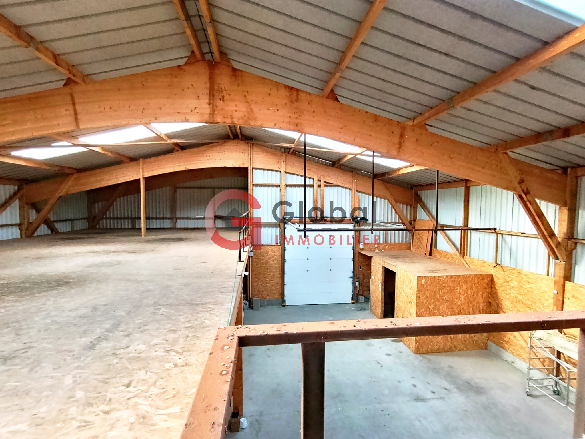 Une partie atelier et stockage d’environ 150 m² complète le rez-de-chaussée, tandis qu’un étage dédié au stockage d’un peu plus de 300 m² permet une organisation optimale des volumes. Cet étage est accessible par escalier et adapté à l’utilisation d’un chariot type Fenwick ou monte-charge.