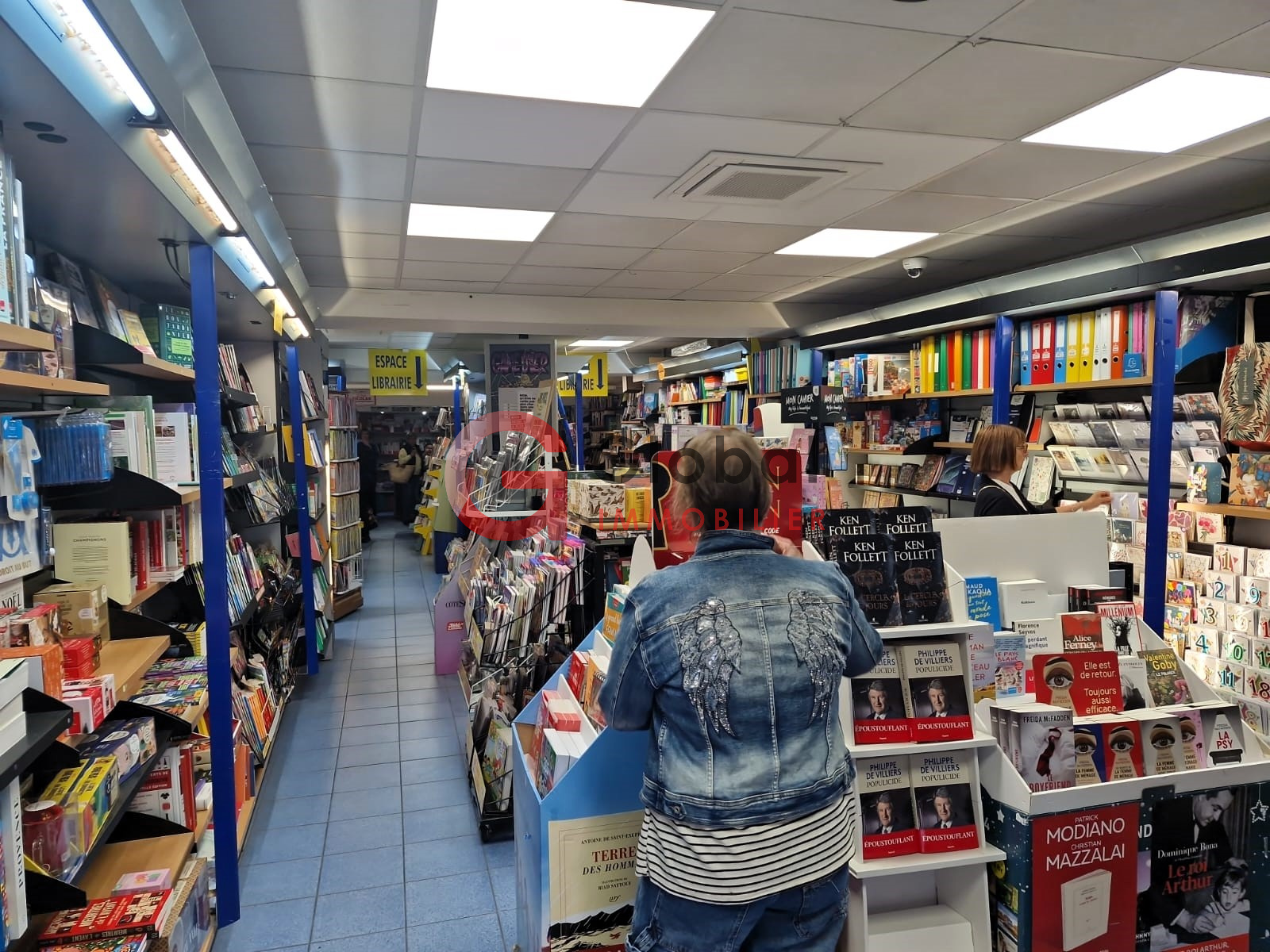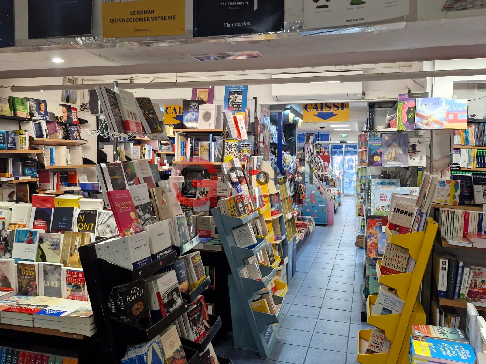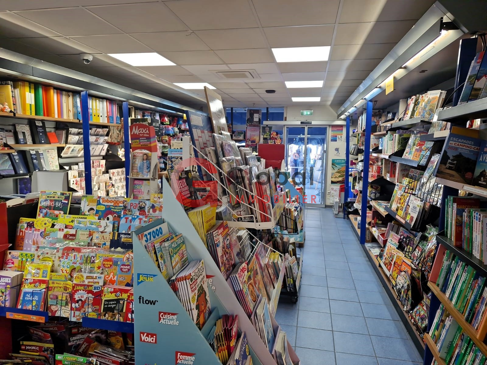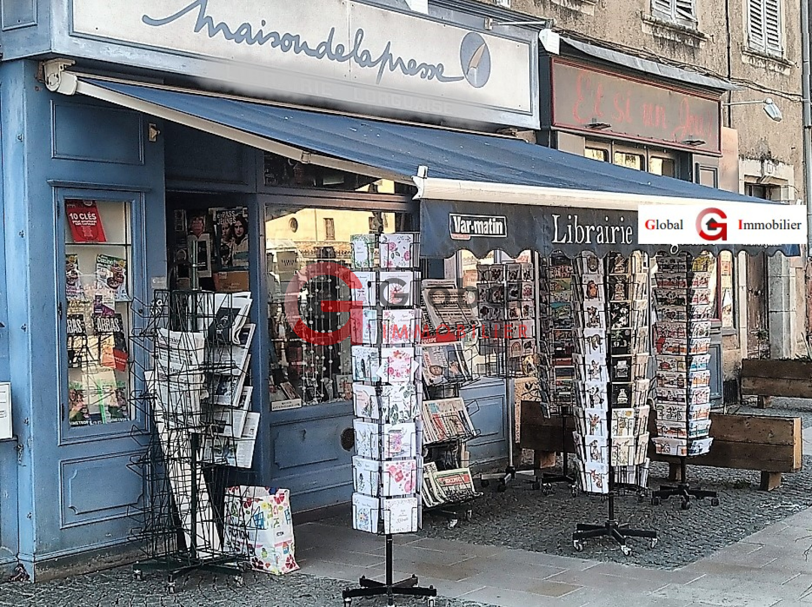 Boutique climatisée de 100m2, devanture dans la tradition libraire couleur Bleu Azur, Expo Presse et carterie en terrasse, Réserve de 70m2.