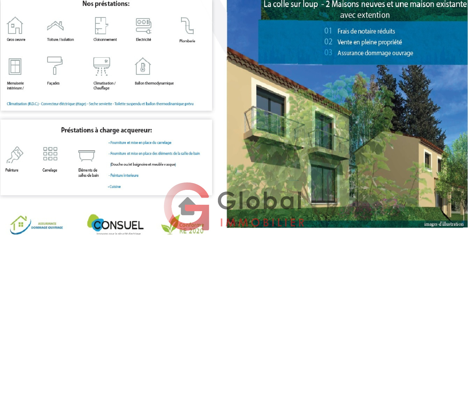 VENDU FRAIS DE NOTAIRE AVANTAGEUX - QUARTIER TRES RECHERCHE A LA COLLE SUR LOUP, proche St Paul de Vence, *** EXCLUSIVITE*** RARE SUR LE MARCHE. M. EHRLACHER vous propose, proche école et toutes commodités, sur un terrain de 706 m², une jolie villa individuelle de 4 pièces (villa 2) en pleine propriété de 100 m² surface de plancher avec une belle allure architecturale et aux normes thermiques actuelles (RE 2020). Au RDC, un grand espace de vie de 45 m² environ desservi par une belle terrasse avec un auvent, un cellier, toilettes invités. A l'étage, 3 chambres dont une suite parentale, une salle de bain et un wc indep. 2 places de parking privatives. Prestations : climatisation réversible au rdc, double vitrage, baies vitrées et volets roulants en alu anthracite, cumulus thermodynamique,wc suspendus. Vous vous installerez début de l'année 2025. Aucune avance ! (hors mis le dépot de garantie à la réservation), vous paierez votre villa à la remise des clés ! Frais de notaire avantageux.Toutes les garanties sont prévues. Avis du professionnel : On aime l'emplacement (possibilité d'aller au village à pied), l'exposition, le quartier pavillonnaire, l'accès aux transports publics à 2 pas, la construction stylée au gout du jour, la possibilité de construire une piscine et le prix ! Idéal famille. Pour plus d'infos 06 02 71 79 09 PHOTOS INTERIEURES NON CONTRACTUELLES - OFFRE SERIEUSE ETUDIEE