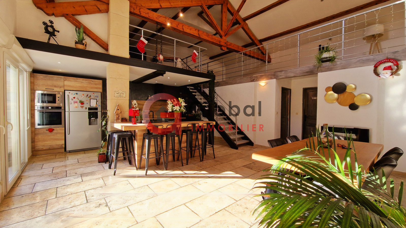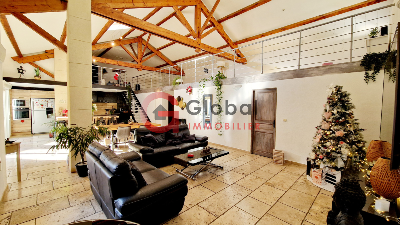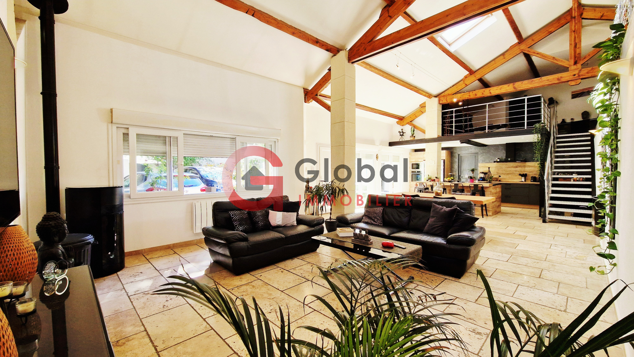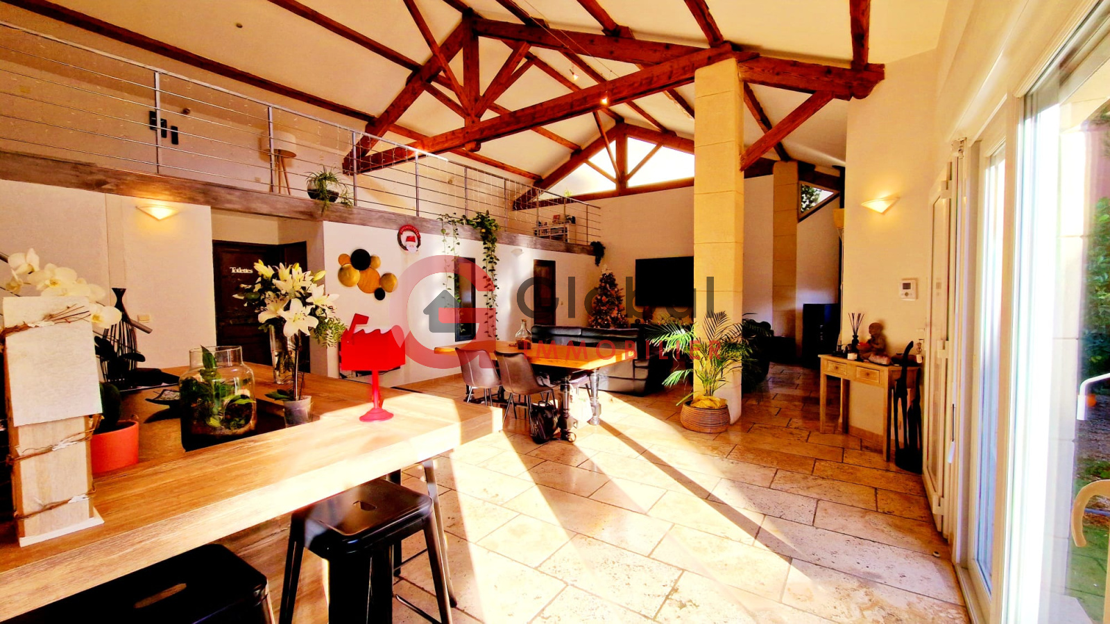 Cette maison atypique de 125m² de plain-pied (hors mezzanine et dépendance) offre une qualité de vie incomparable. Dès l'entrée, vous serez séduits par les volumes spectaculaires de la pièce de vie "cathédrale" de 68m², où l'authenticité de la charpente en bois rencontre l'élégance du travertin, pour créer une ambiance chaleureuse.