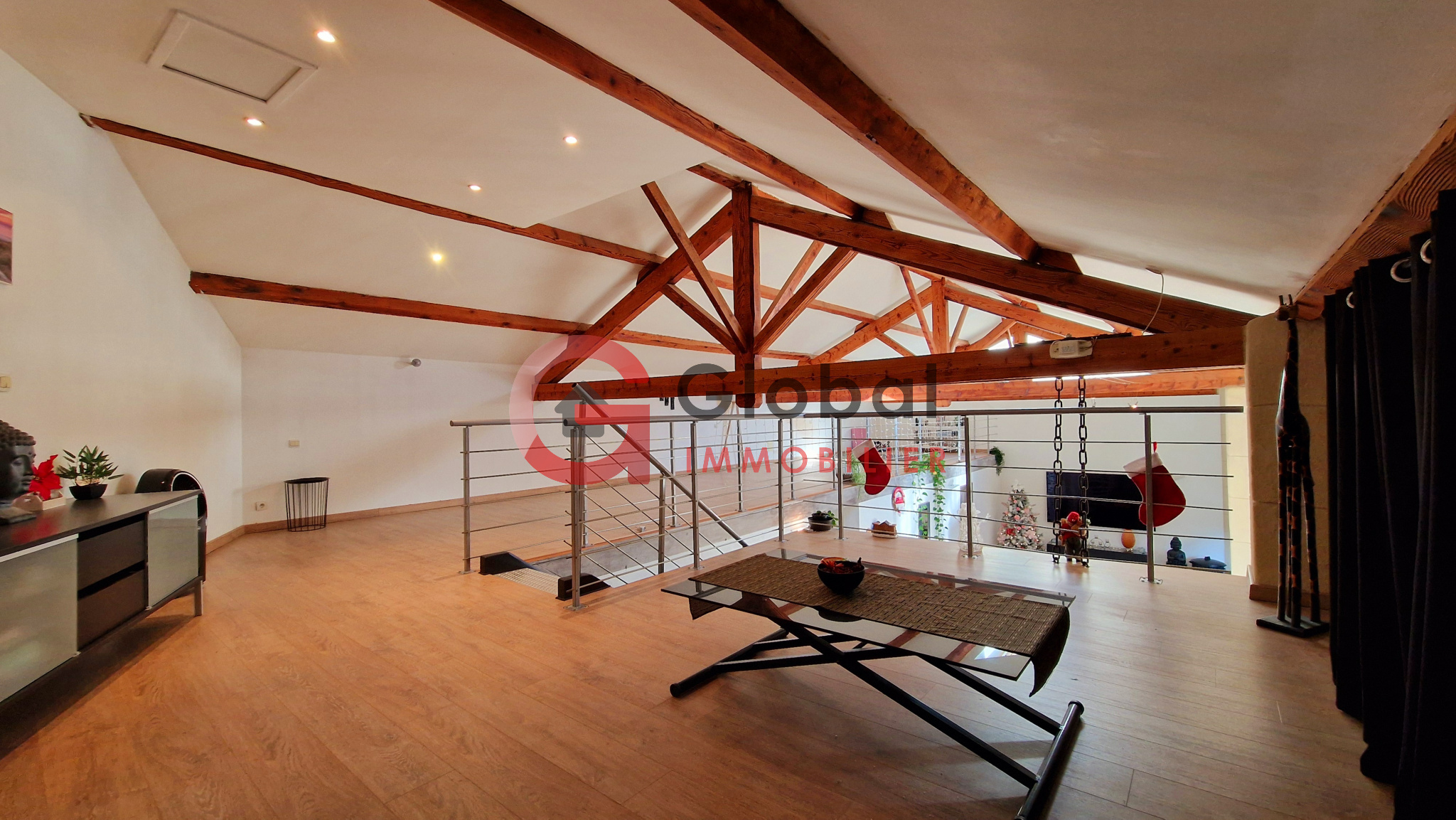 L'escalier graphique mène ensuite sur un vaste plateau en mezzanine. Cet espace polyvalent, niché sous les poutres apparentes, offre une surface utile généreuse de plus de 60m² (dont 48m² supérieurs à 1,80m) idéale pour un espace bureau, du stockage, un coin lecture, salle de sport ou de jeux avec vue plongeante sur le séjour.