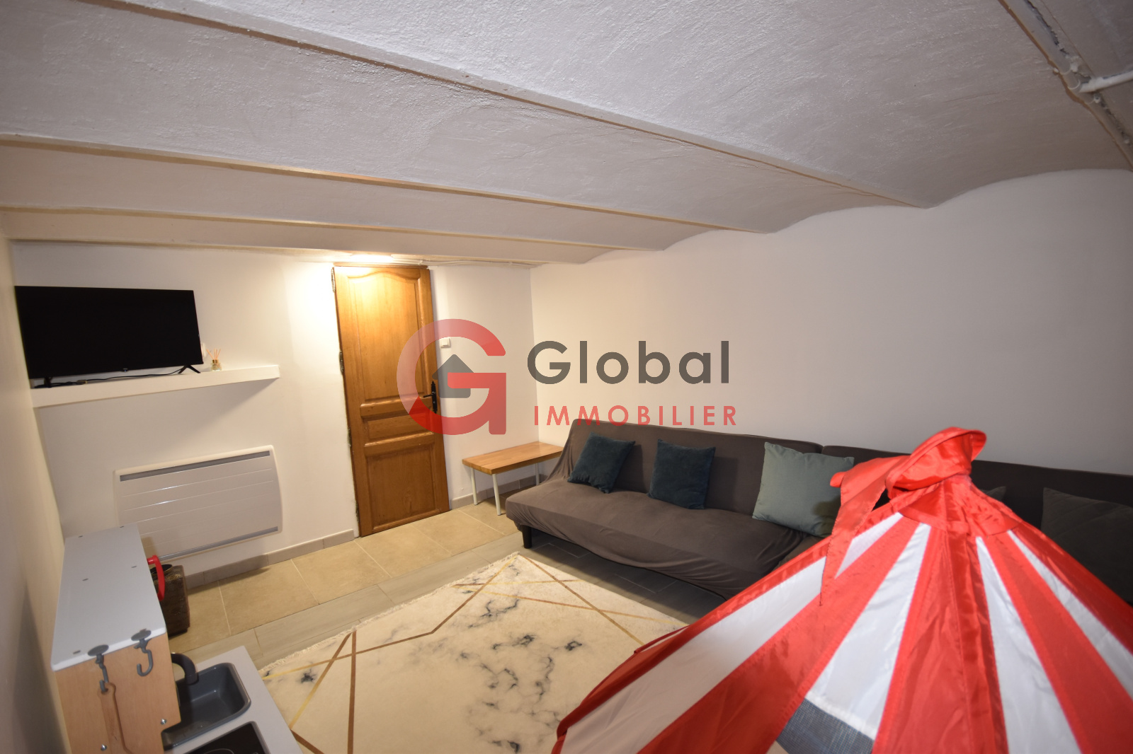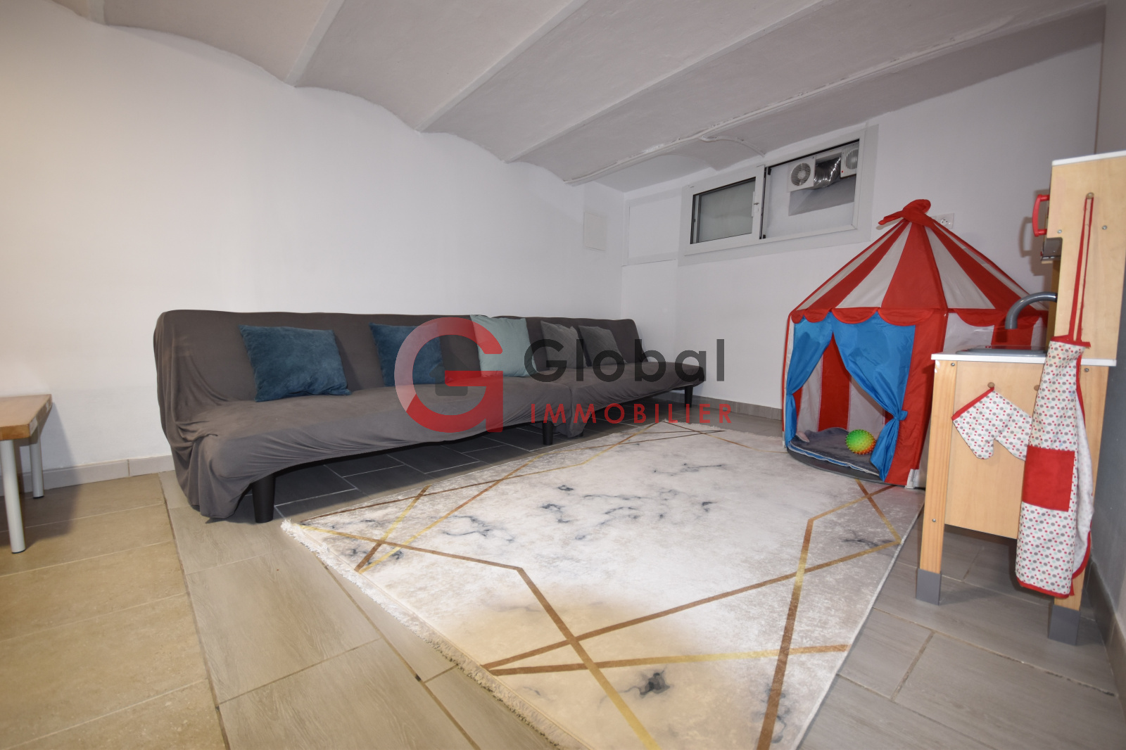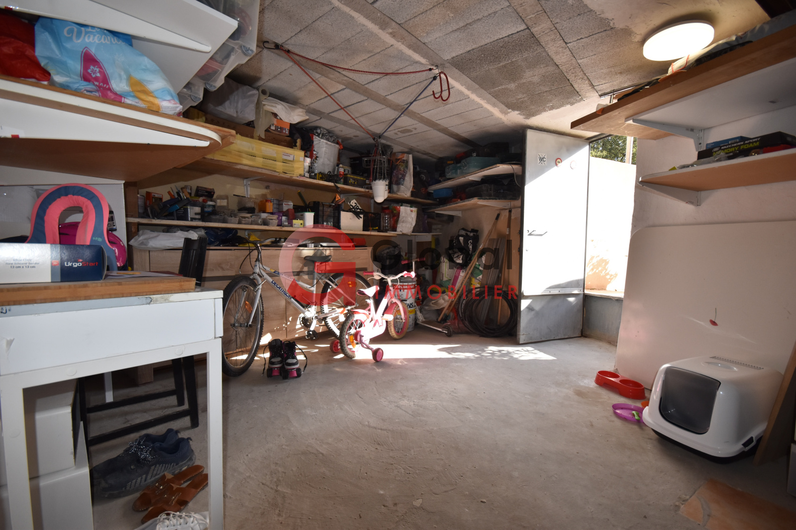 Au Rez-de-chaussée, un salon/ cuisine, une salle d'eau et une chambre, à l'étage deux chambres, une salle de bain et une terrasse, et au sous sol une salle de jeux et un atelier.