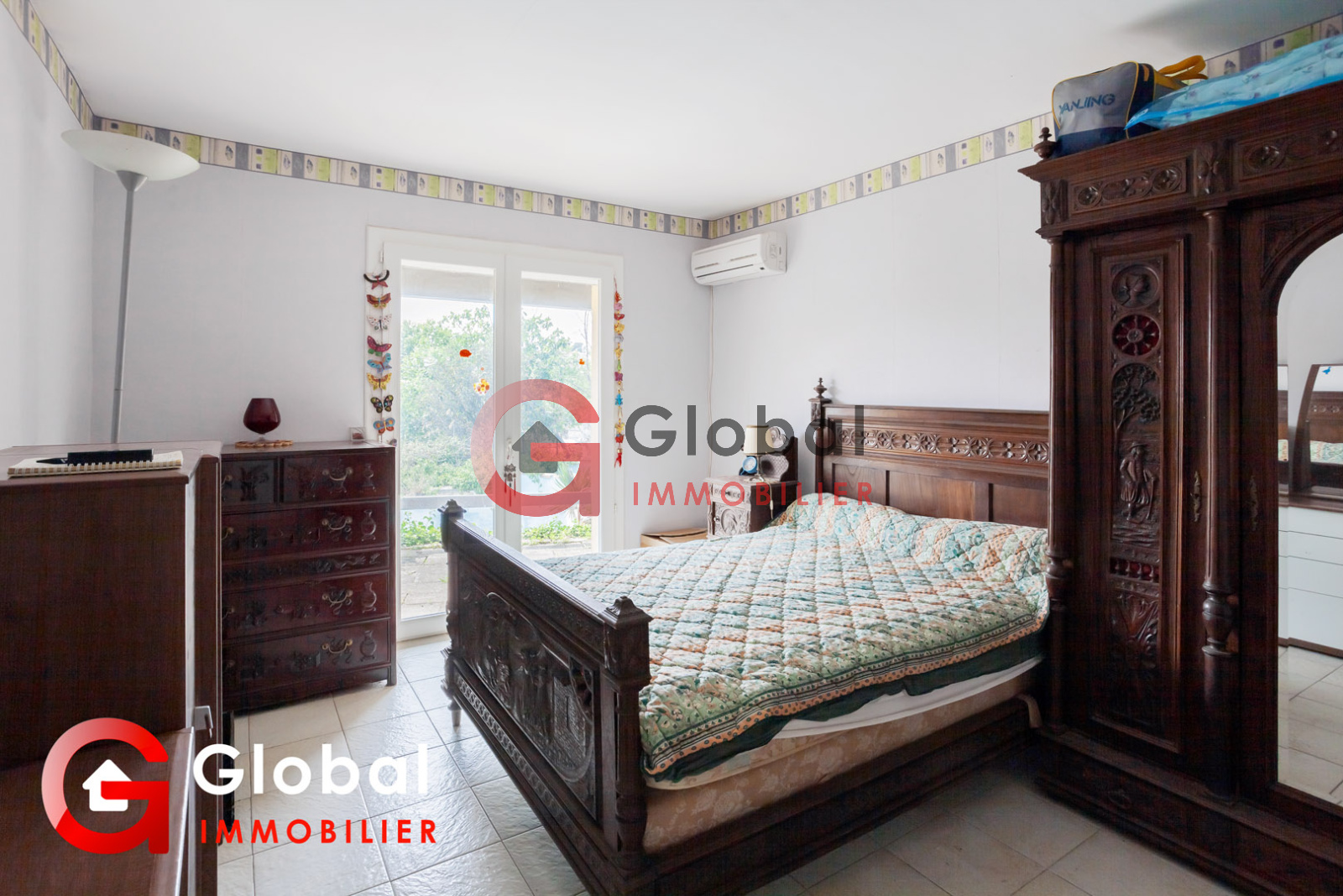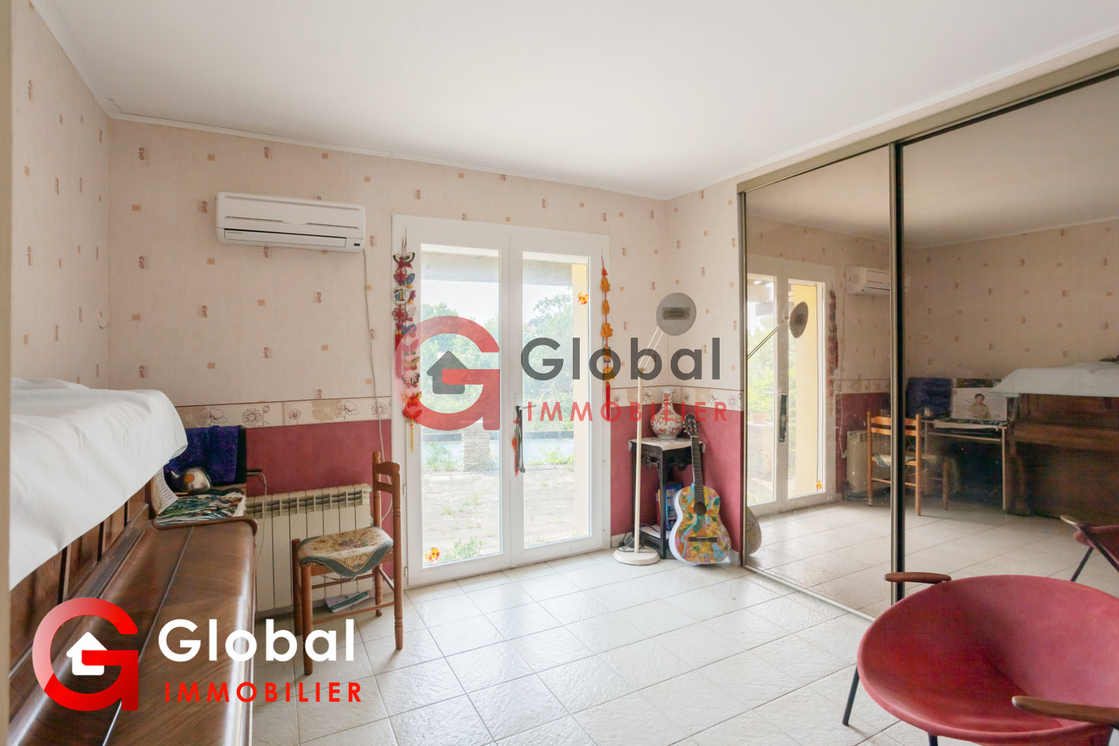 Porte fenêtre avec accès terrasse Grand placard avec portes miroir Carrelage Clim réversible