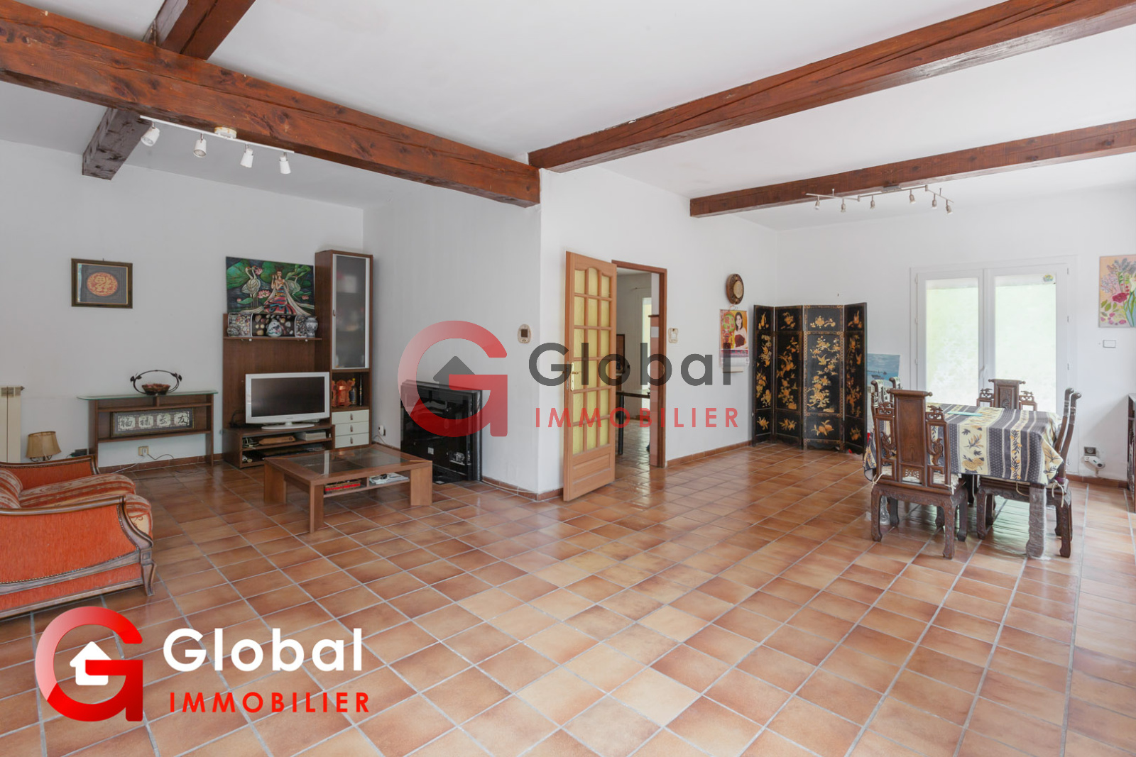 Poutres apparentes Carrelage Cheminée fonctionnelle Clim réversible Baies vitrées double vitrage Accès cuisine et terrasse Petit escalier vers chambres et SdB