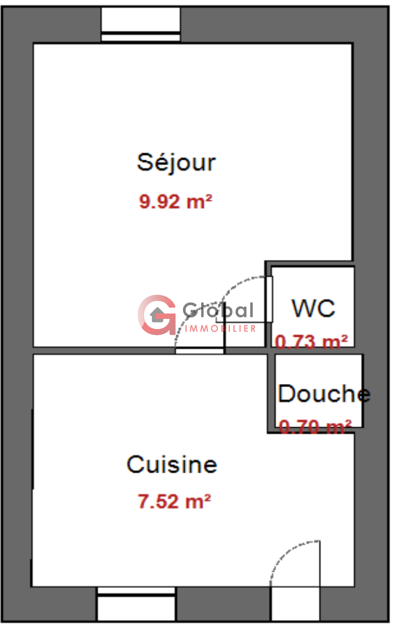 - Composition : sas d’entrée, séjour avec cuisine, chambre, salle d’eau avec WC