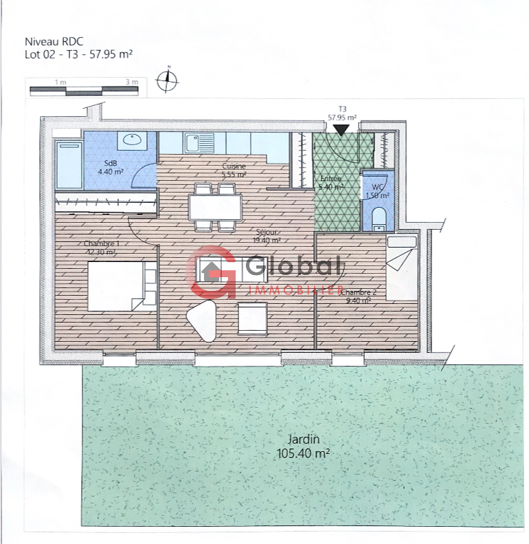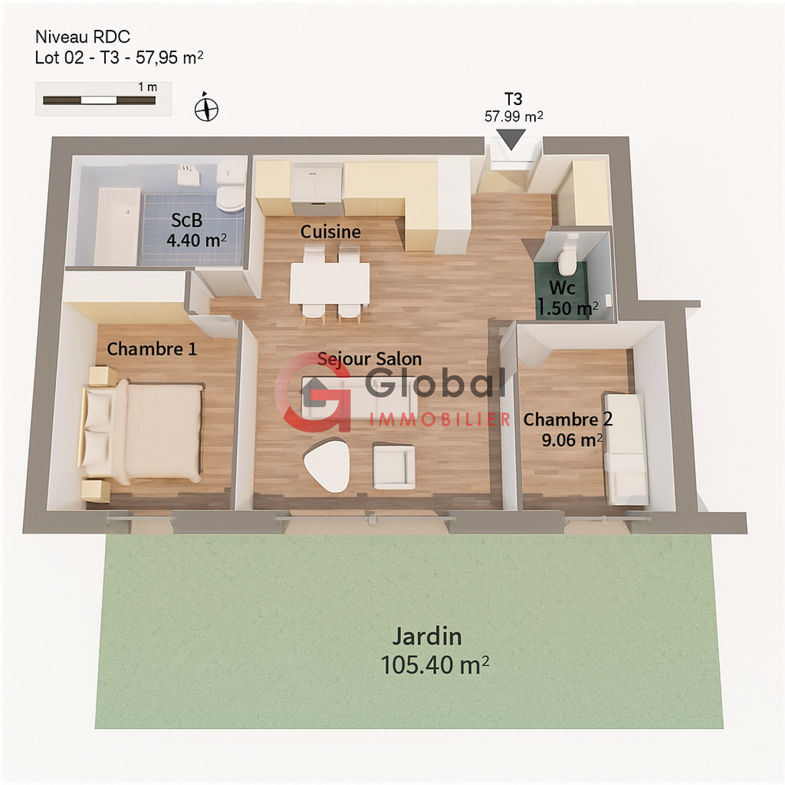 D’une surface totale bien agencée, ce bien offre une vie de plain-pied idéale, avec un jardin privatif de plus de 100 m².