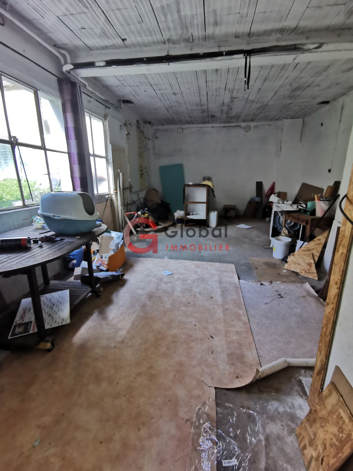 Actuellement en cours de rénovation, elle offre au rez-de-chaussée une cuisine, deux vastes pièces, une salle d'eau avec WC déjà rénové, ainsi qu'un grand atelier avec accès direct sur le jardin.