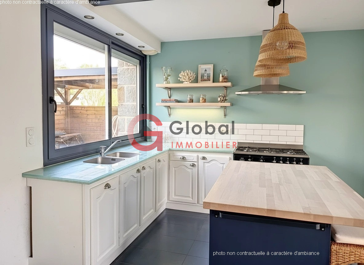 Le rez-de-chaussée se compose d’une cuisine ouverte aménagée et équipée, d’une grande pièce de vie lumineuse de 39 m² avec accès direct dans le jardin et bénéficiant d’une exposition Sud Est Ouest, offrant ainsi un espace convivial et agréable au quotidien avec le soleil du matin au soir. Une entrée, WC, une buanderie avec lit d’appoint dans placard intégré et point d’eau, ainsi qu’un atelier complètent ce niveau.