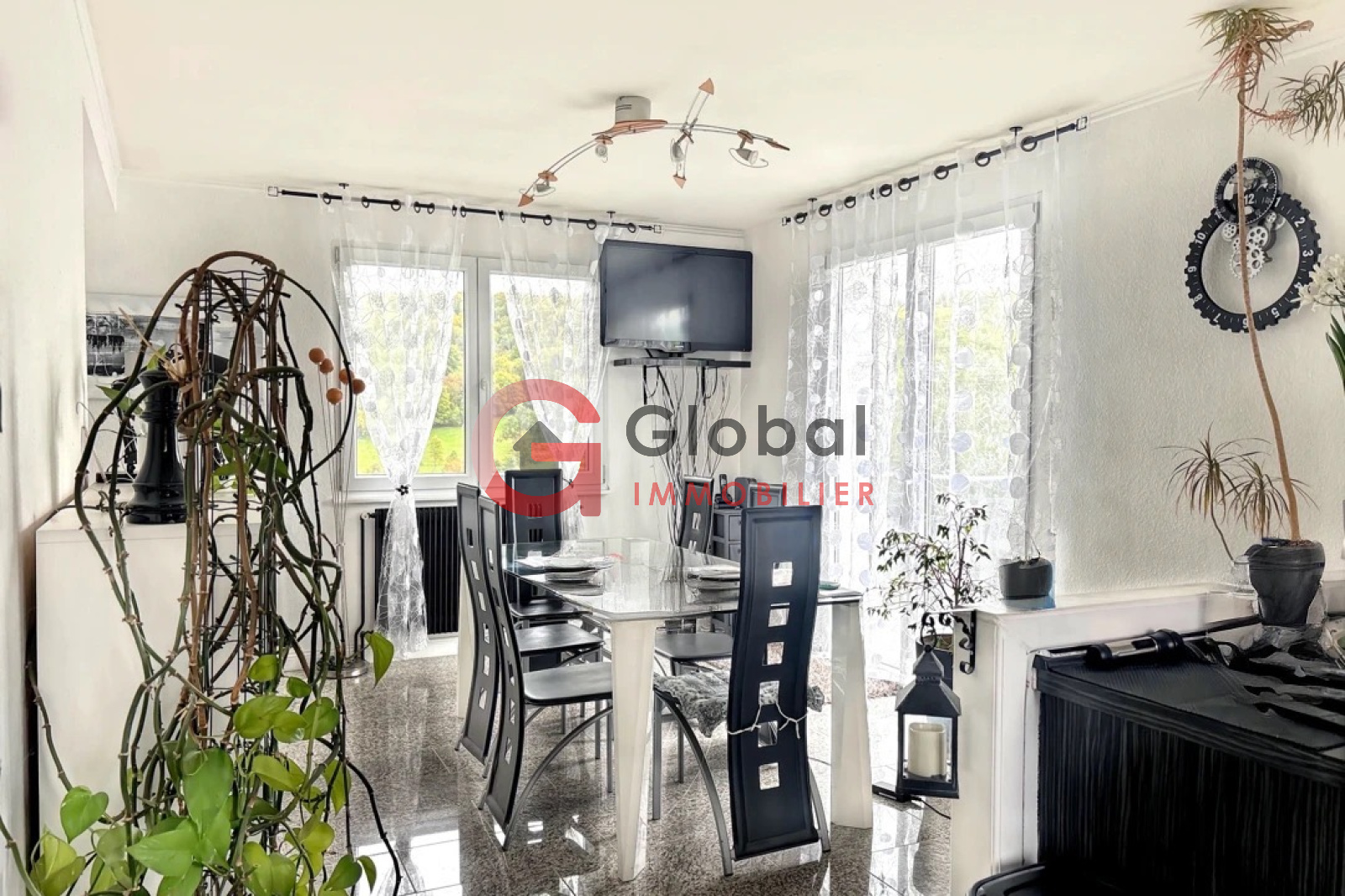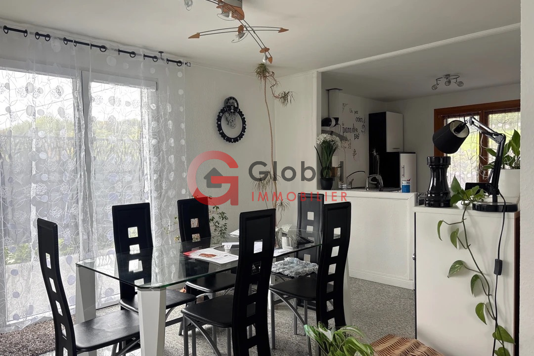 Salle a manger lumineuse avec accès a la terrasse par une porte vitrée.