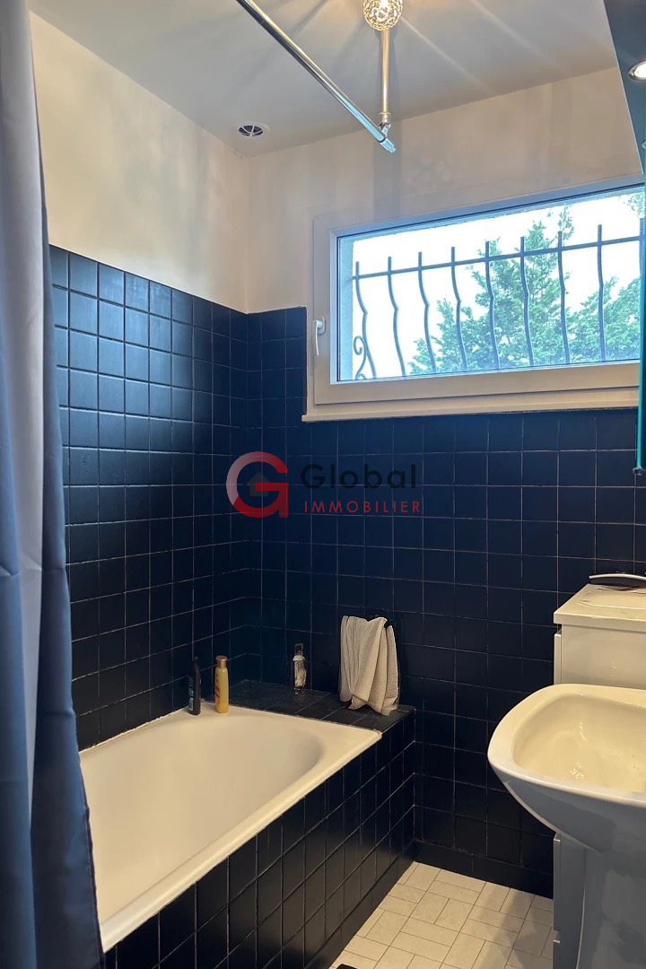 Salle de bain avec baignoire et lavabo. Lumineuse