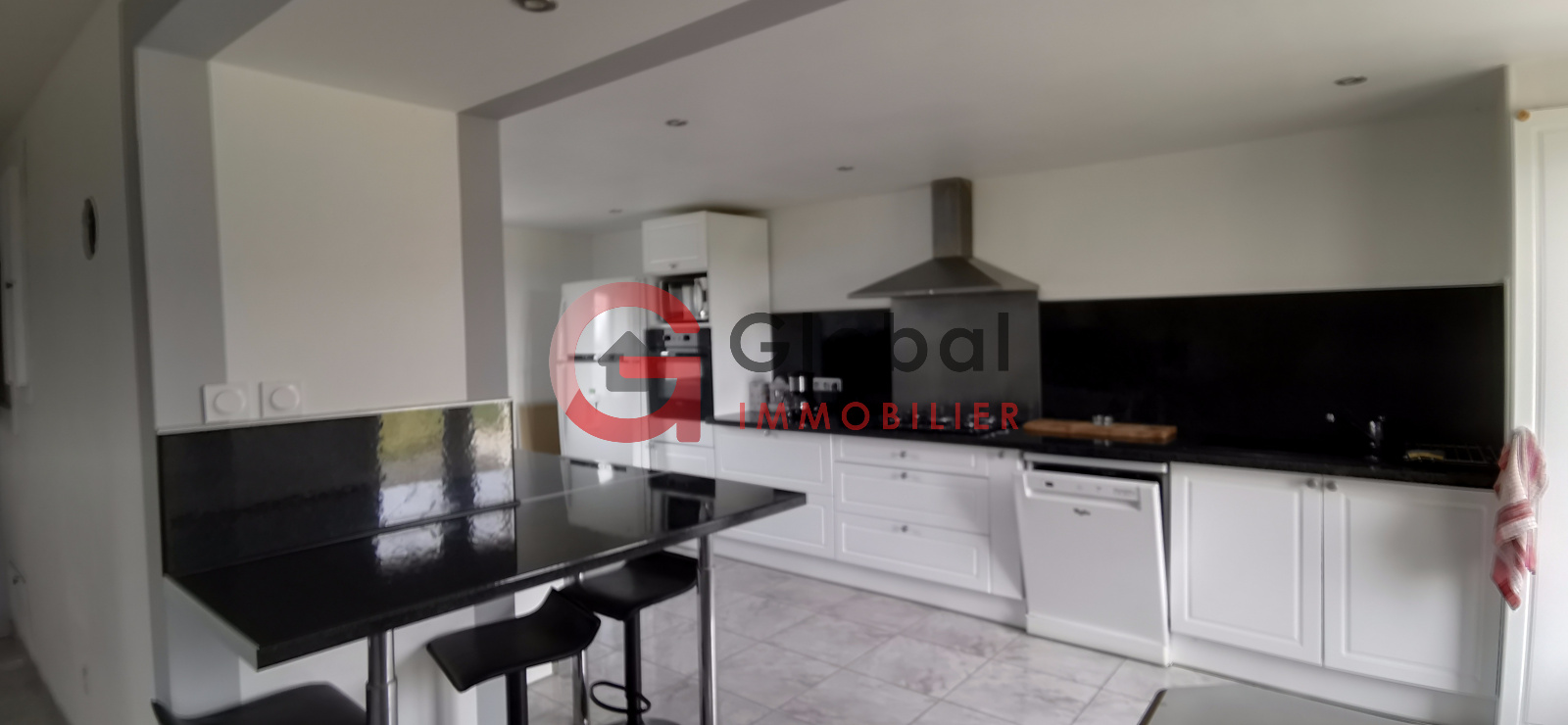 Le rez-de-chaussée offre une cuisine aménagée de plus de 16 m2 semi-ouverte sur un séjour lumineux de 27,5 m2, un salon et des WC séparés.