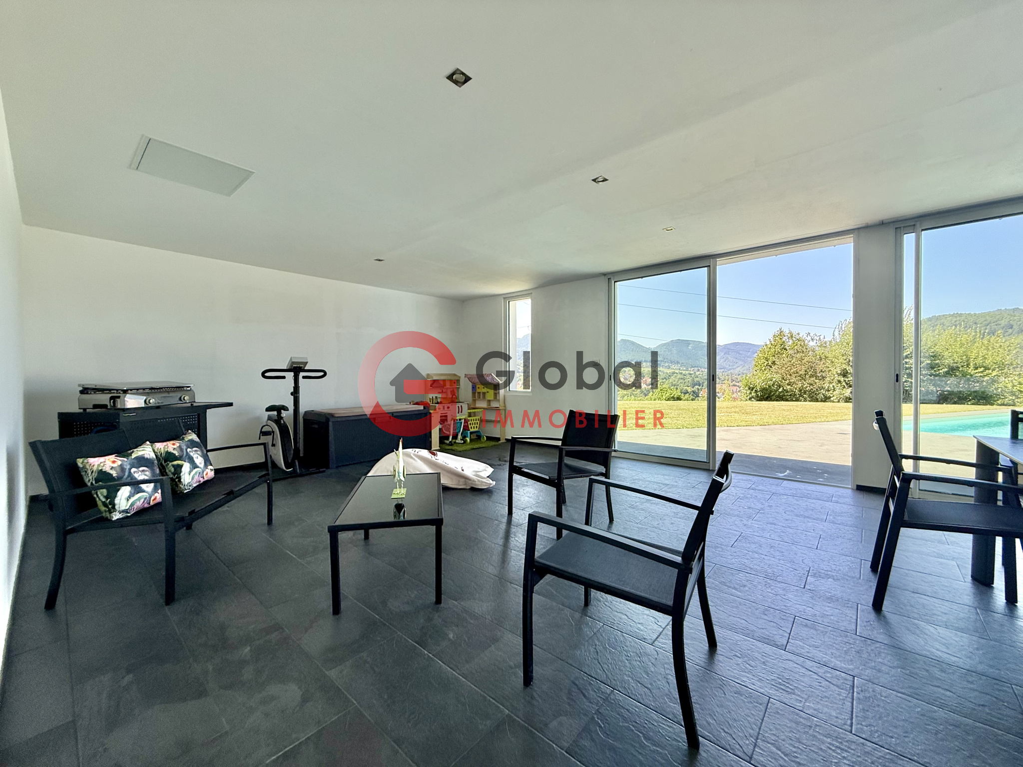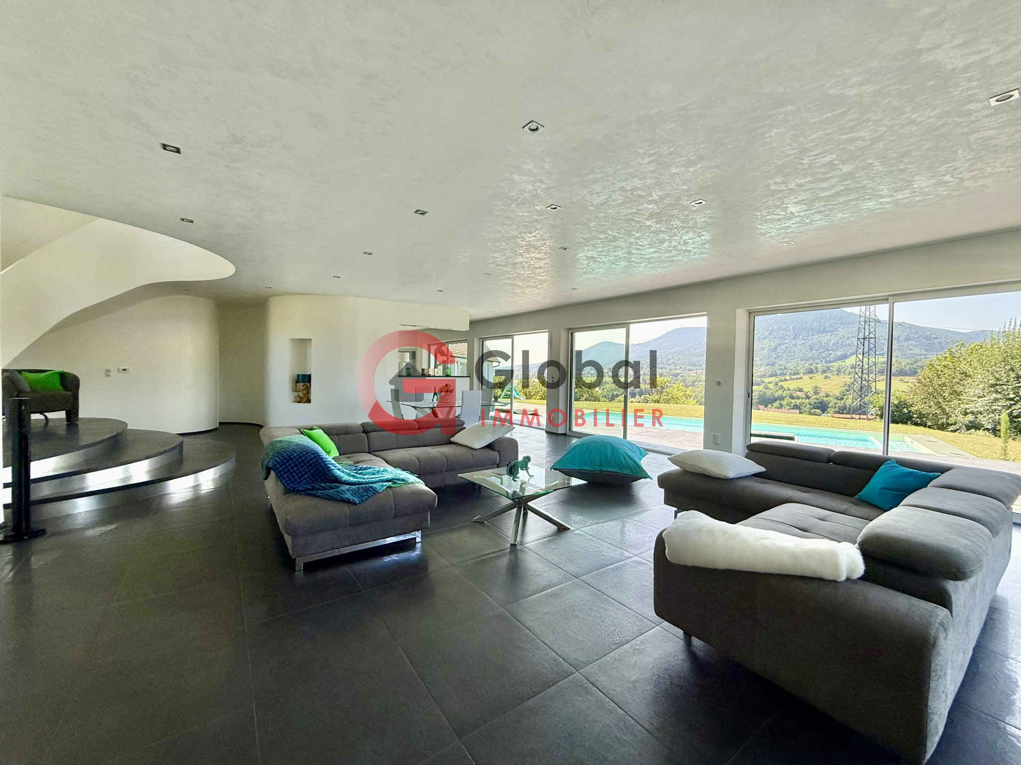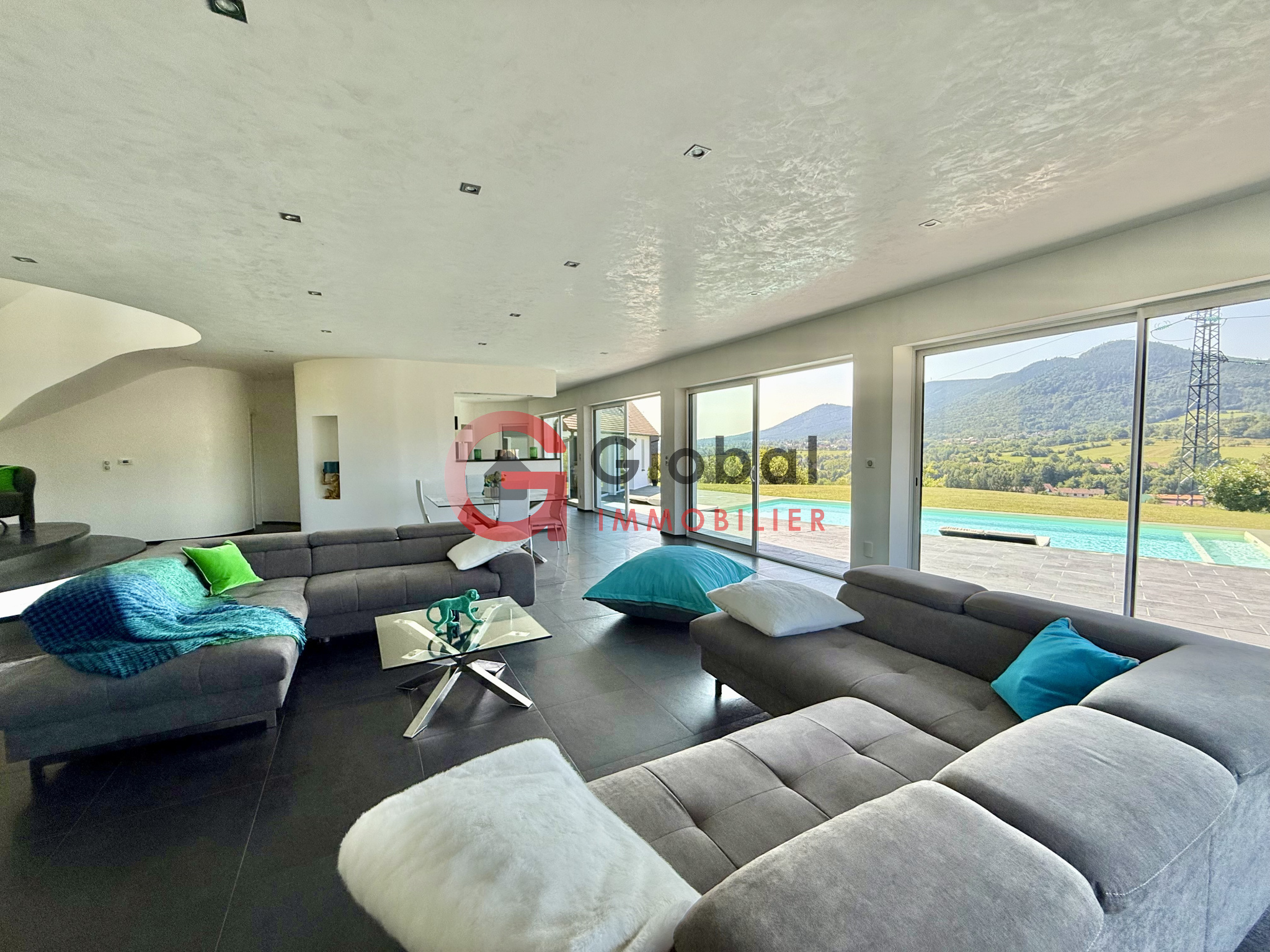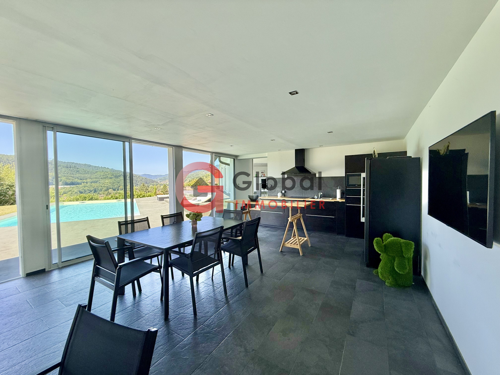 A l'intérieur, vous disposerez d'un gigantesque espace de vie d'environ 97m2, offrant un spectacle permanent sur la nature environnante grâce à ses murs de baies vitrées. Dans son prolongement, une terrasse exceptionnelle de 195m2 surplombe la vallée, idéale pour les repas en plein air et les moments de détente au bord de la piscine (11 x 5 m).