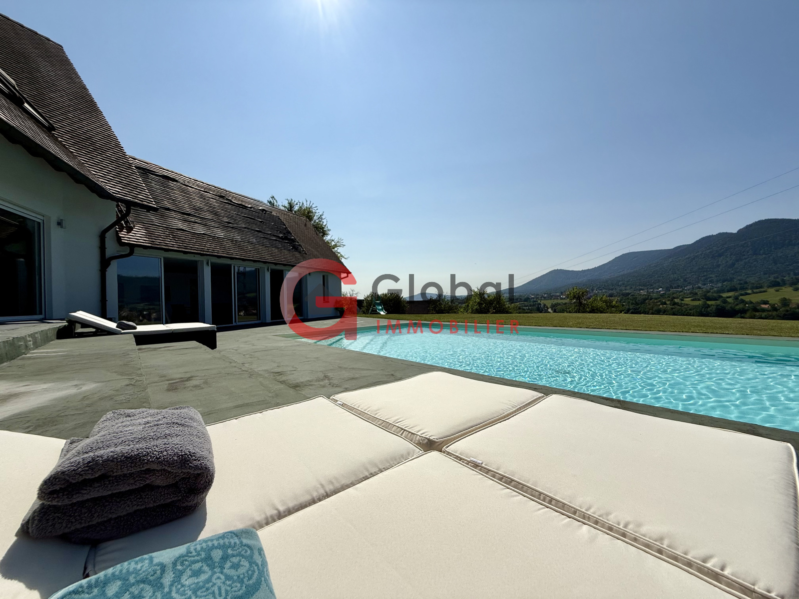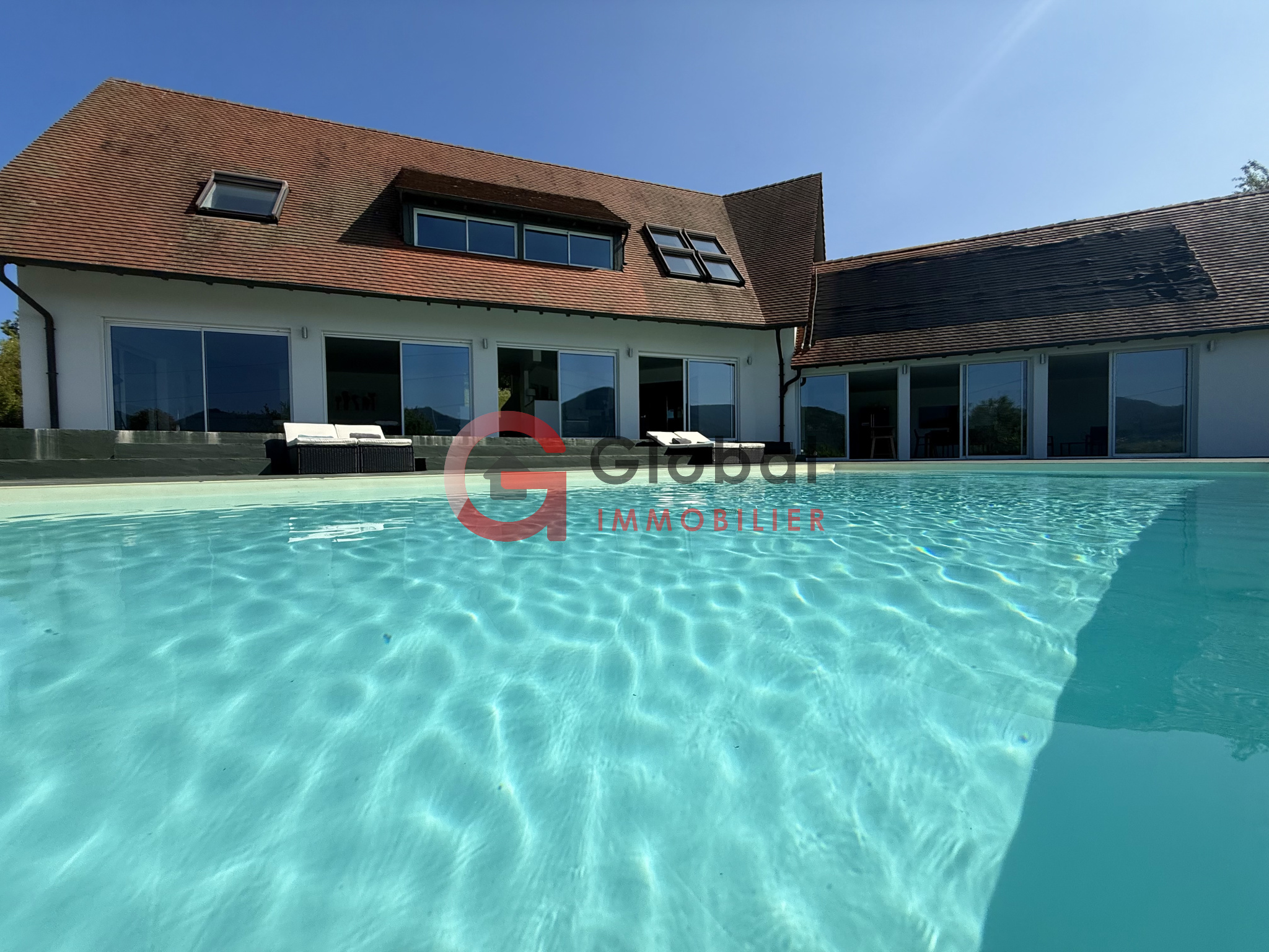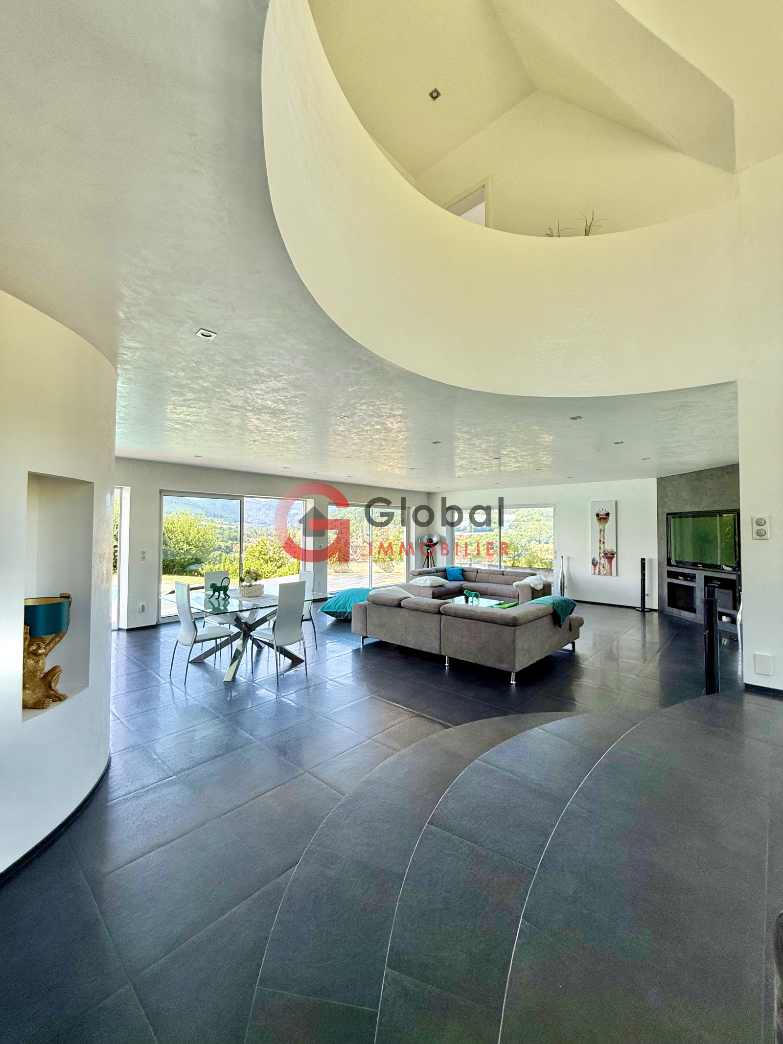 A l'intérieur, vous disposerez d'un gigantesque espace de vie d'environ 97m2, offrant un spectacle permanent sur la nature environnante grâce à ses murs de baies vitrées. Dans son prolongement, une terrasse exceptionnelle de 195m2 surplombe la vallée, idéale pour les repas en plein air et les moments de détente au bord de la piscine (11 x 5 m).