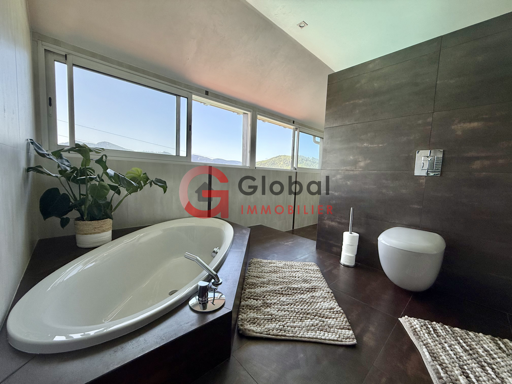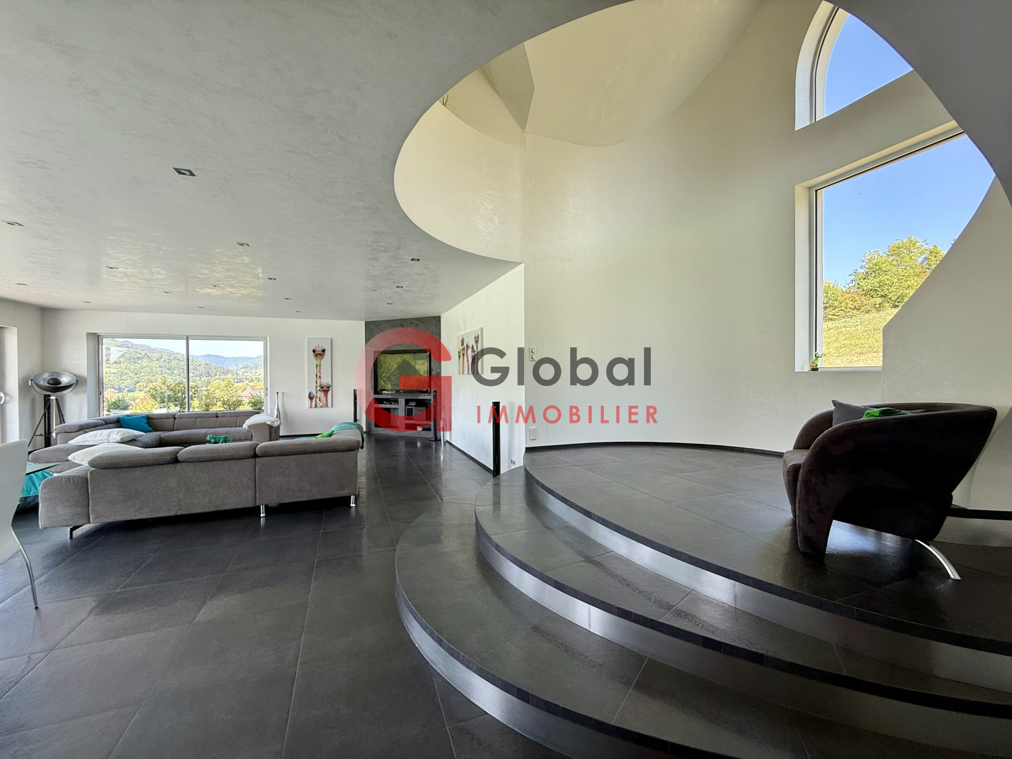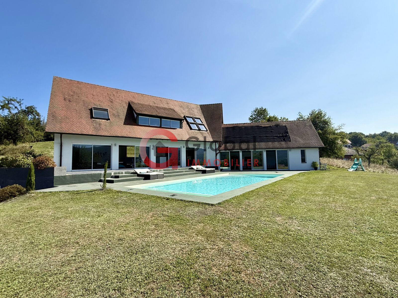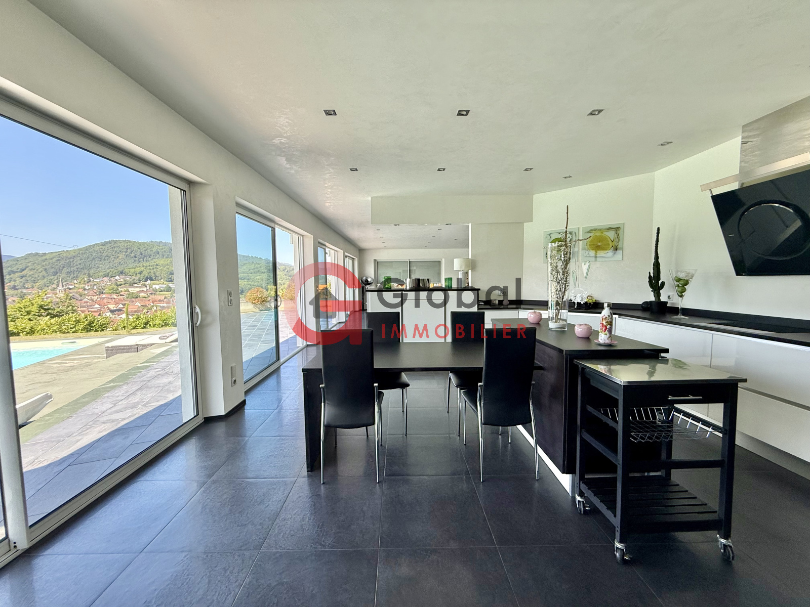 A l'intérieur, vous disposerez d'un gigantesque espace de vie d'environ 97m2, offrant un spectacle permanent sur la nature environnante grâce à ses murs de baies vitrées. Dans son prolongement, une terrasse exceptionnelle de 195m2 surplombe la vallée, idéale pour les repas en plein air et les moments de détente au bord de la piscine (11 x 5 m).