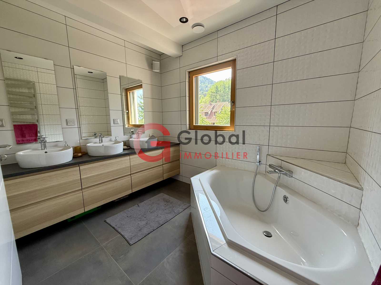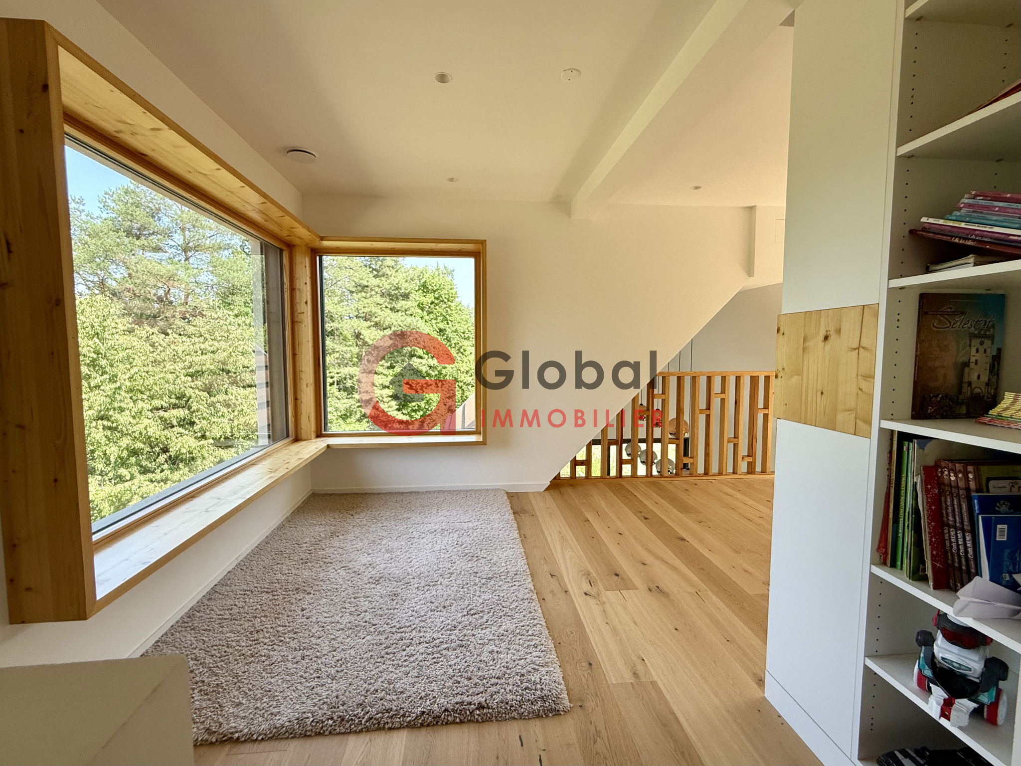 - Au premier étage : une élégante mezzanine offrant une vue plongeante sur le séjour, ainsi que de larges ouvertures tournées vers la vallée et la nature; 3 chambres supplémentaires, une salle de bain avec triple vasque, baignoire et douche, ainsi qu'un deuxième WC séparé.