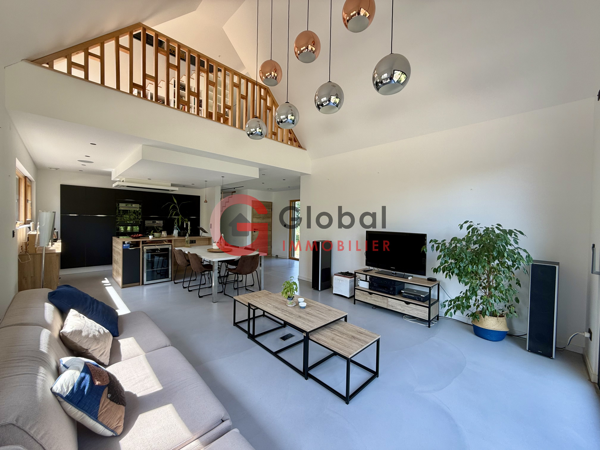 - Au RDC : une belle entrée, une grande et lumineuse pièce de vie avec plafond cathédrale, une cuisine ouverte ultra équipée, une suite parentale avec dressing et salle d'eau (à terminer), une pièce bureau (ou petite chambre), ainsi qu'un WC.