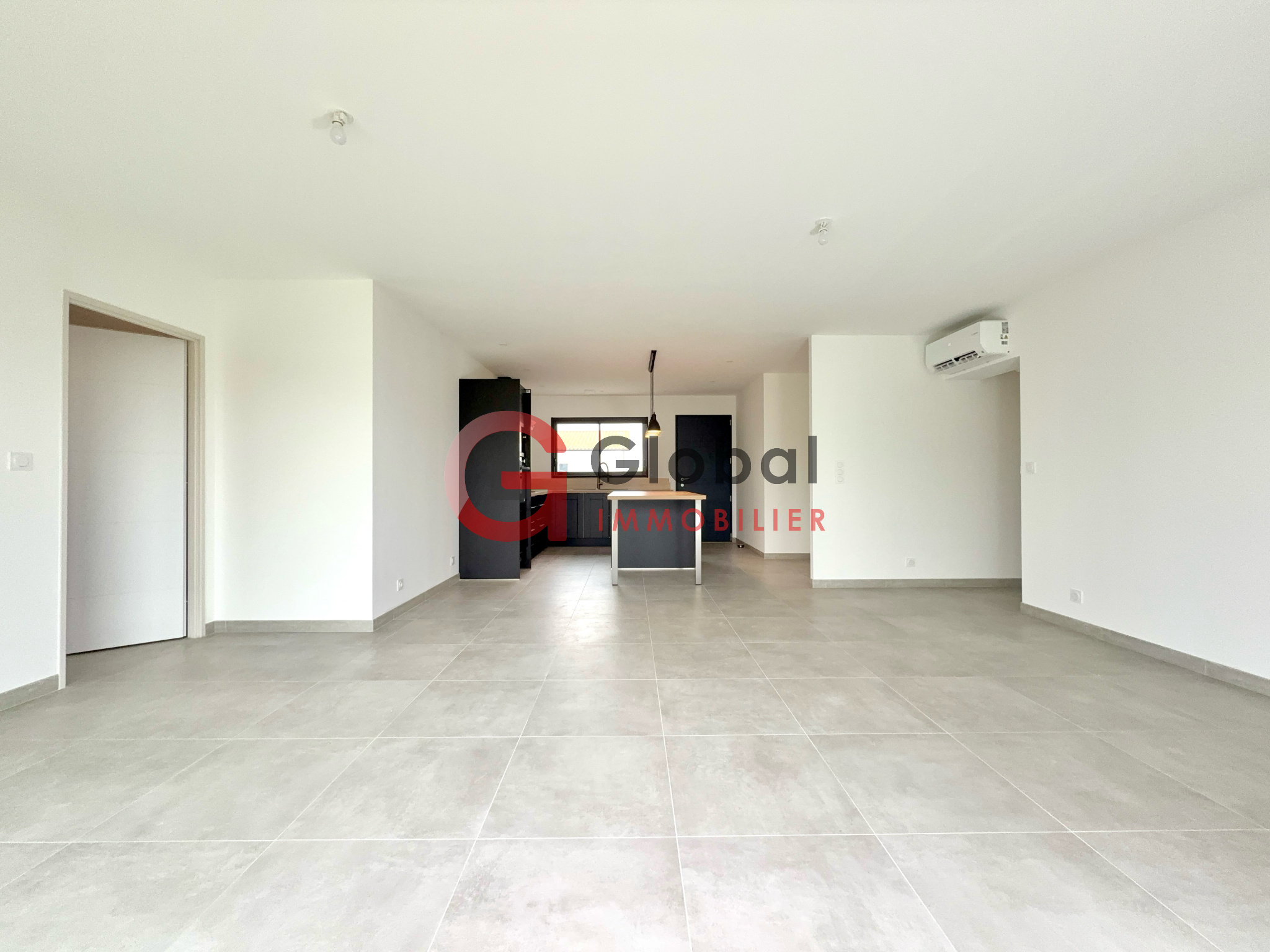 Ce bien comprend une pièce de vie spacieuse avec salon et cuisine ouverte entièrement équipée, trois chambres, une salle d'eau en pierre de travertin, un cellier, un garage fermé avec porte motorisée.