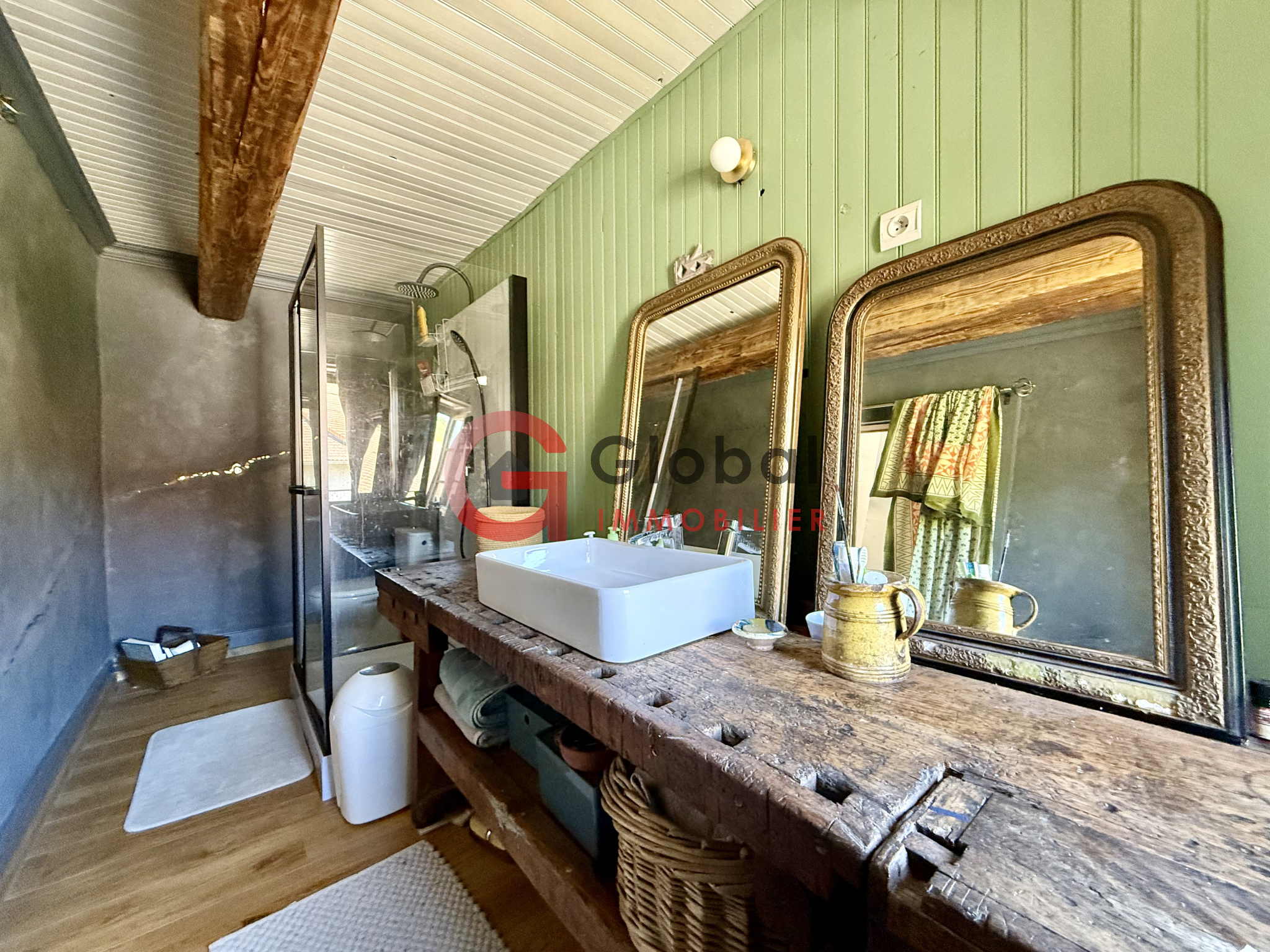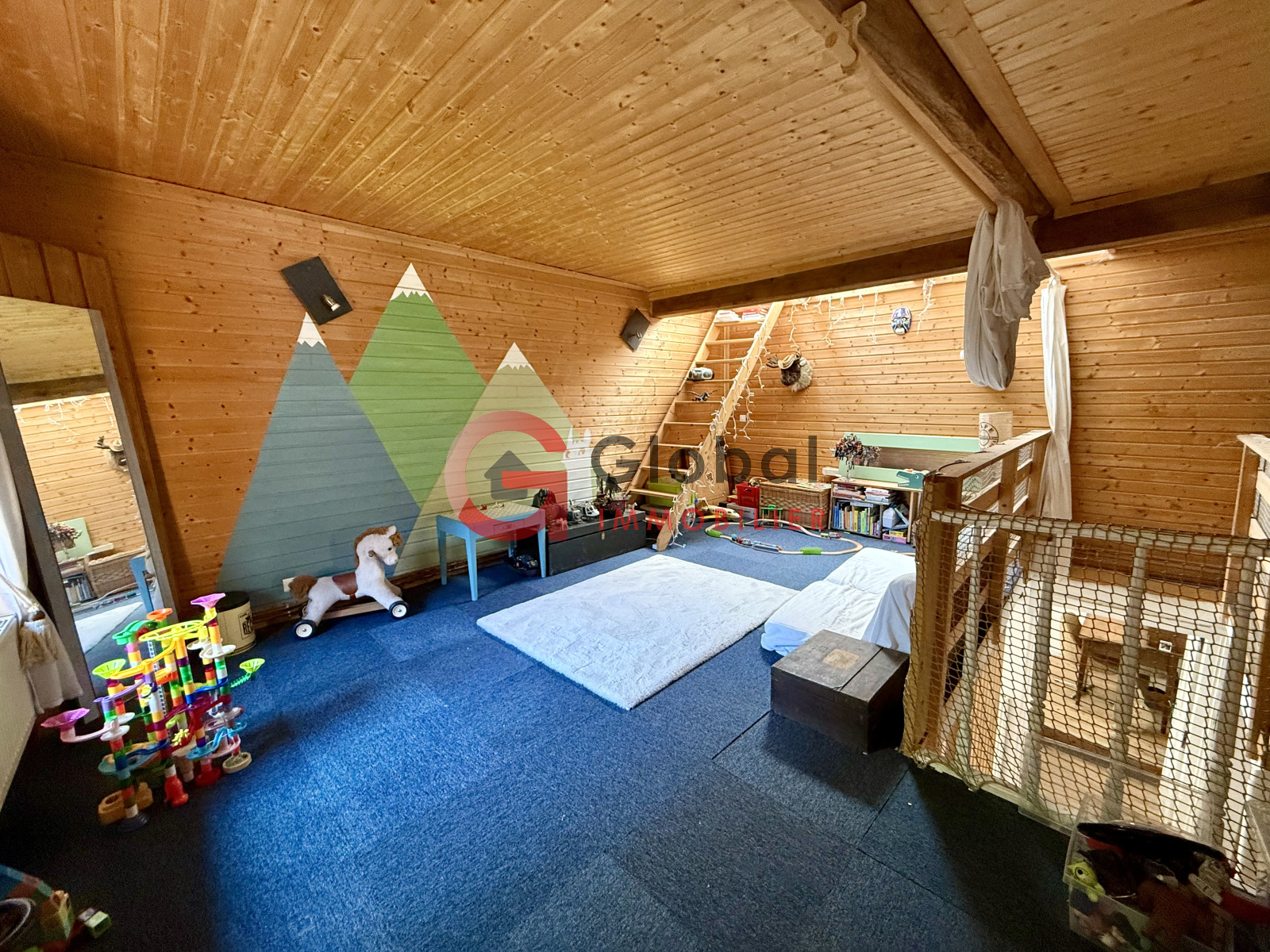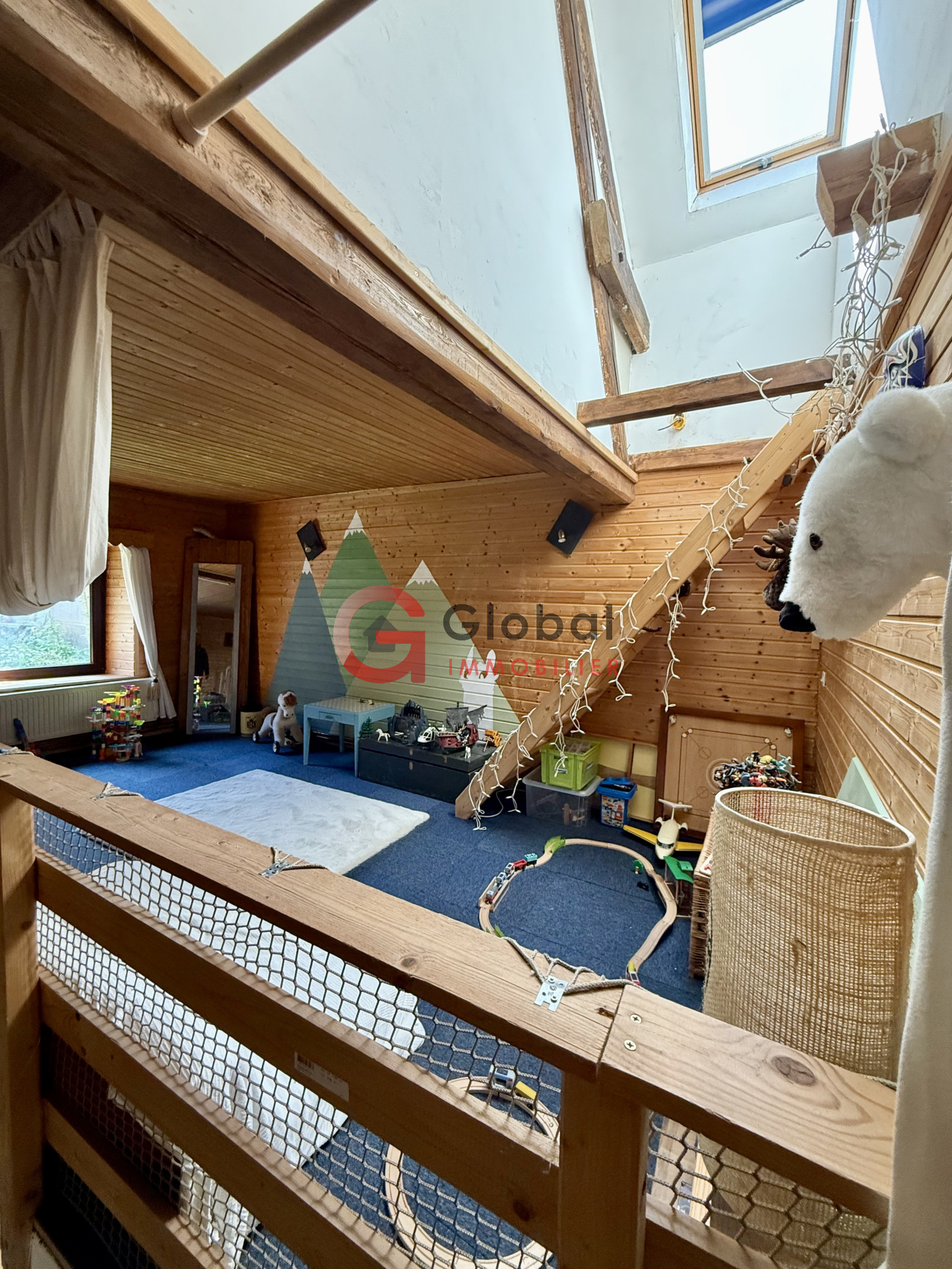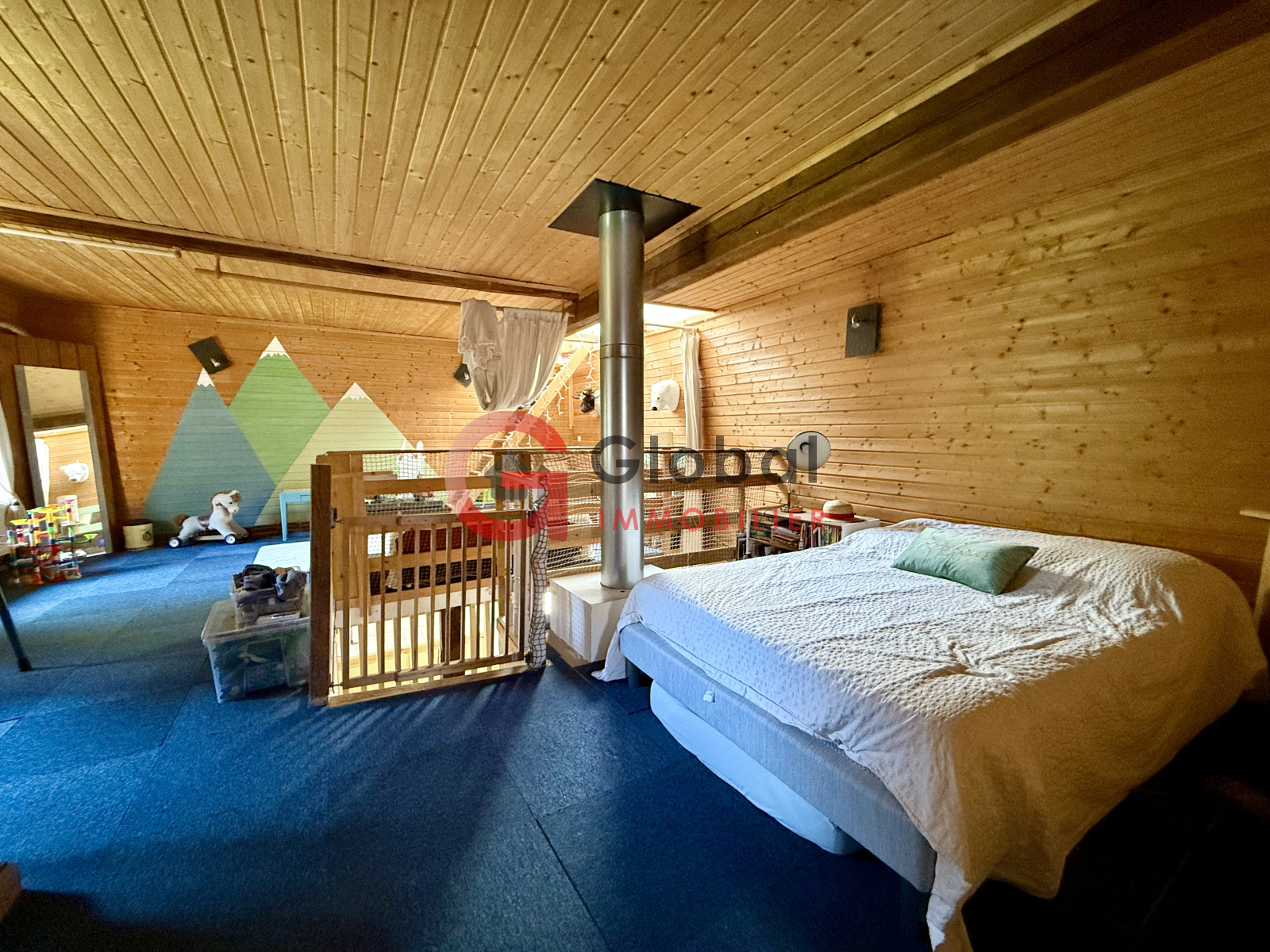 à l'étage, vous disposerez également : d'une grande mezzanine (potentielle salle de jeu / bureau / chambres supplémentaires...), d'une chambre, ainsi que d'une salle d'eau avec douche, vasque et WC.