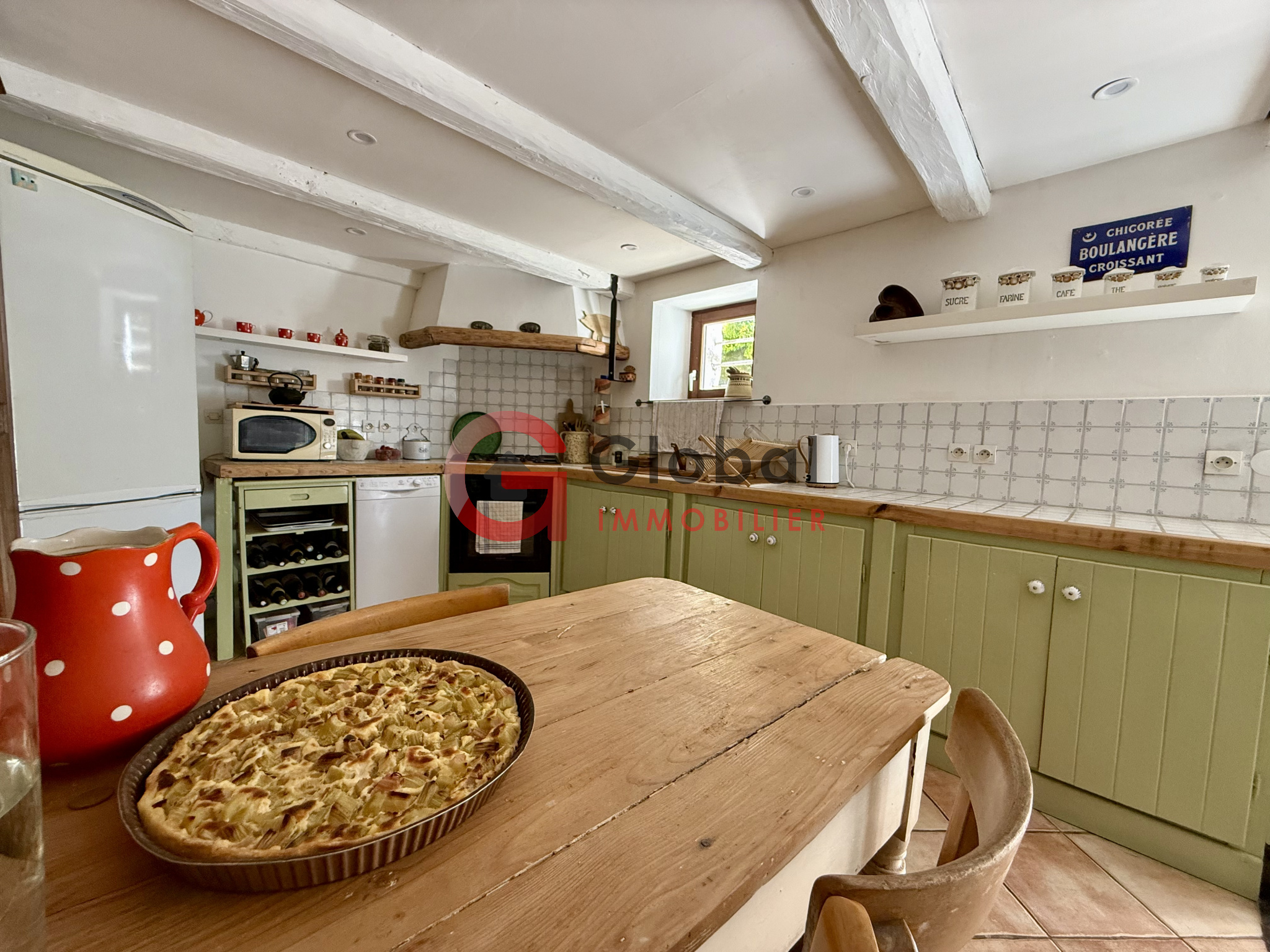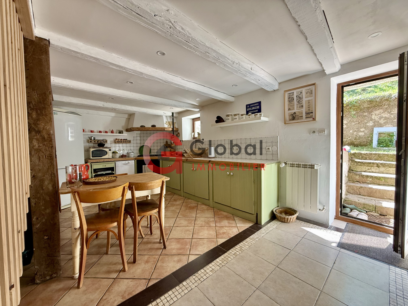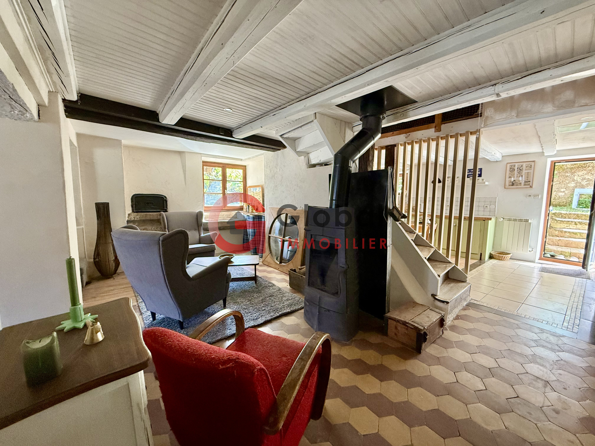 - d'une entrée, d'un beau séjour, d'un salon au coin du feu, d'une mignonne cuisine avec accès direct à la terrasse et au jardin, d'un cellier attenant, d'une très grande chambre, d'un WC et d'une buanderie.